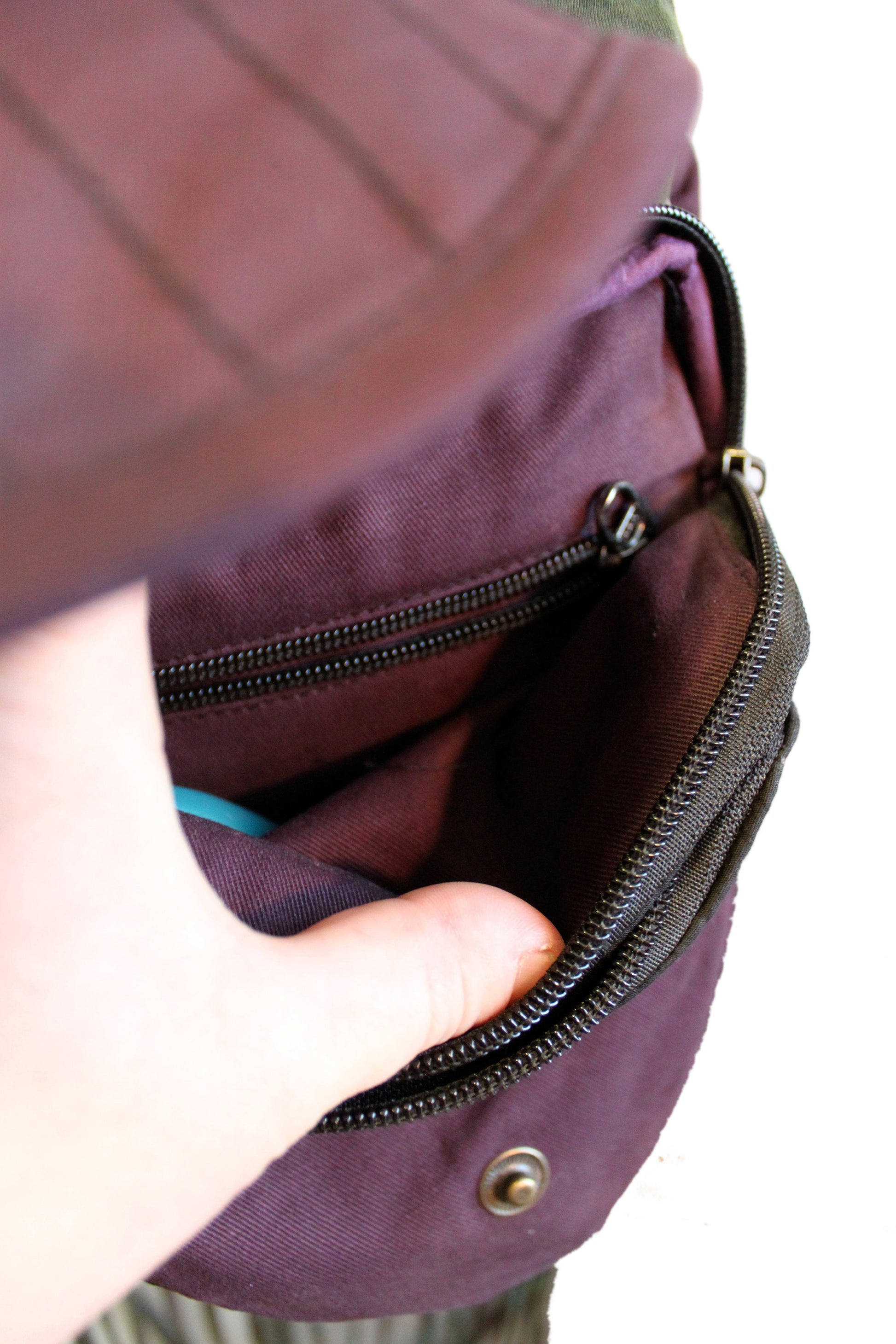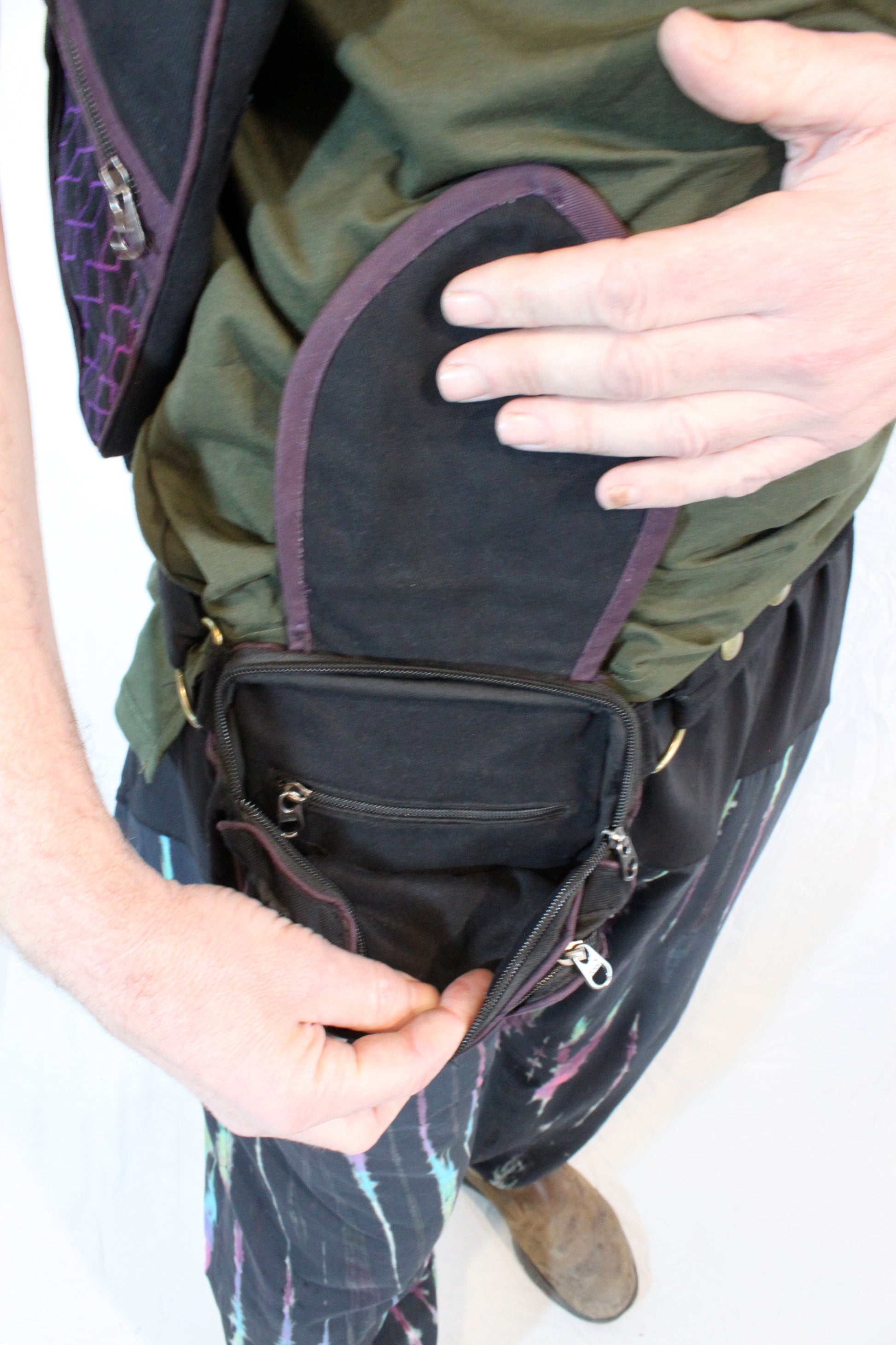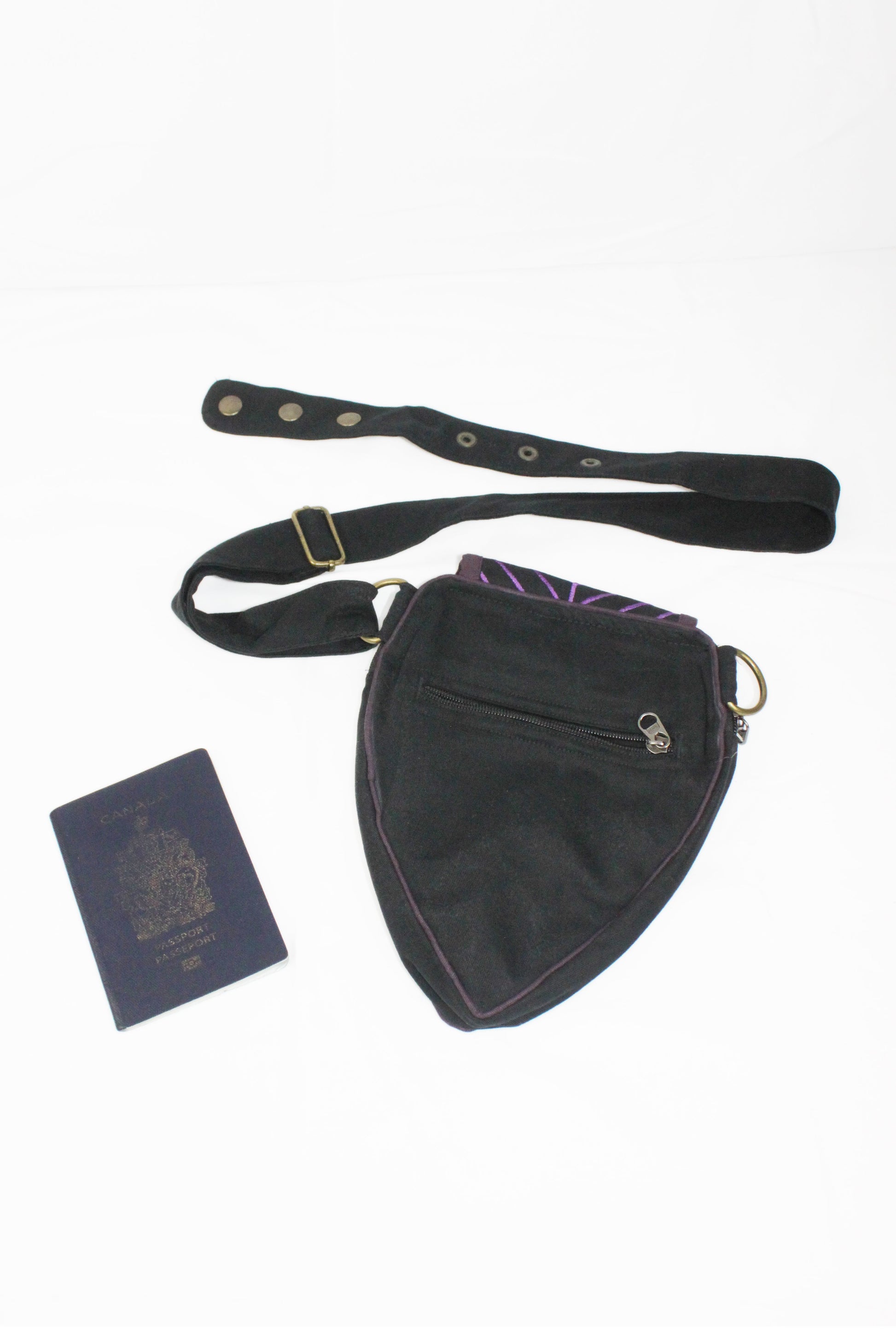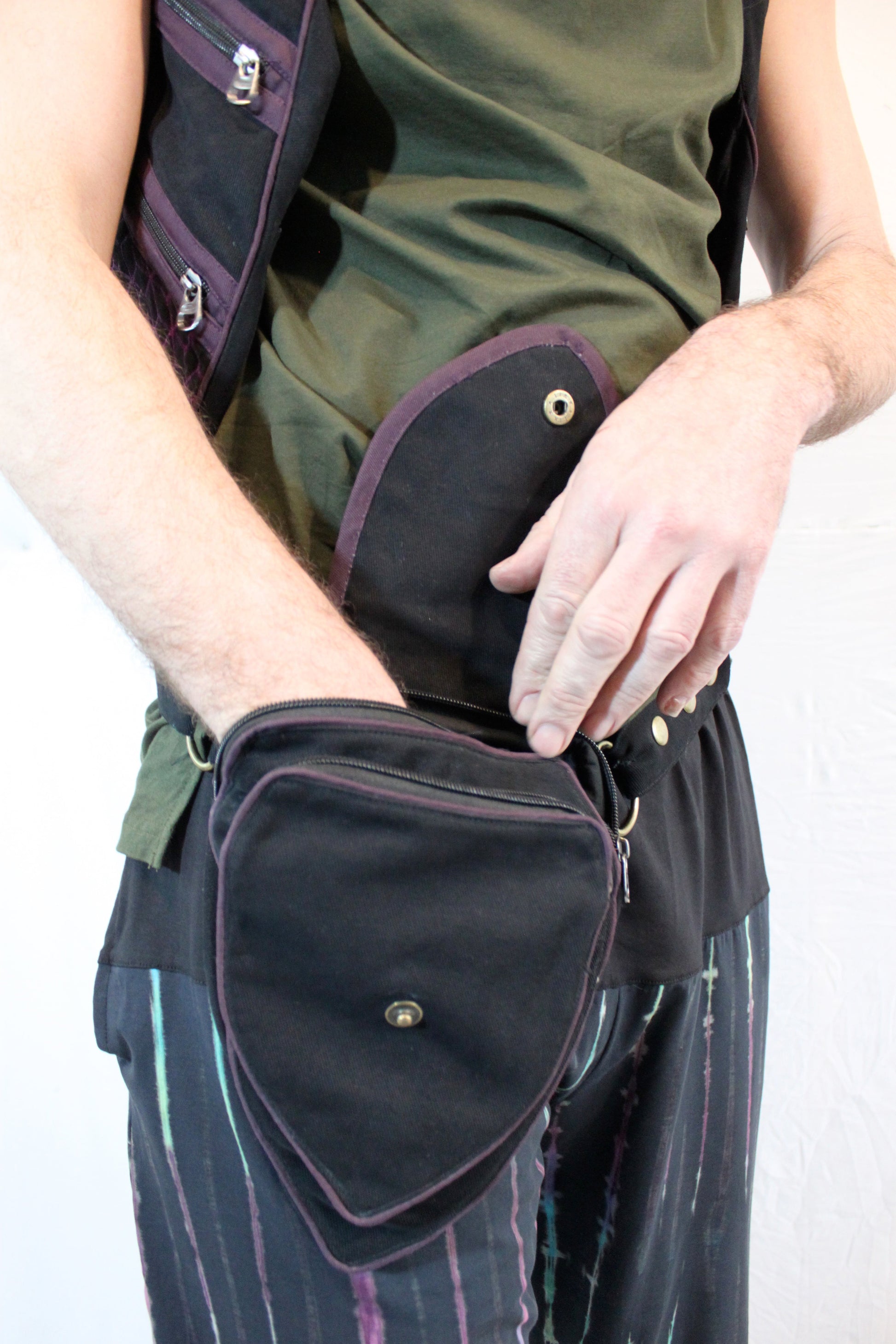 Adornments on this item include antiqued brass hardware such as snaps, rings, and belt adjusters. The rings are perfect for securing a carabiner for those times you just don’t have a free hand to hold your keys or water bottle. By loosening the belt adjuster our hip-pouch becomes a small satchel-style bag to be worn over the shoulder or across the chest as desired.