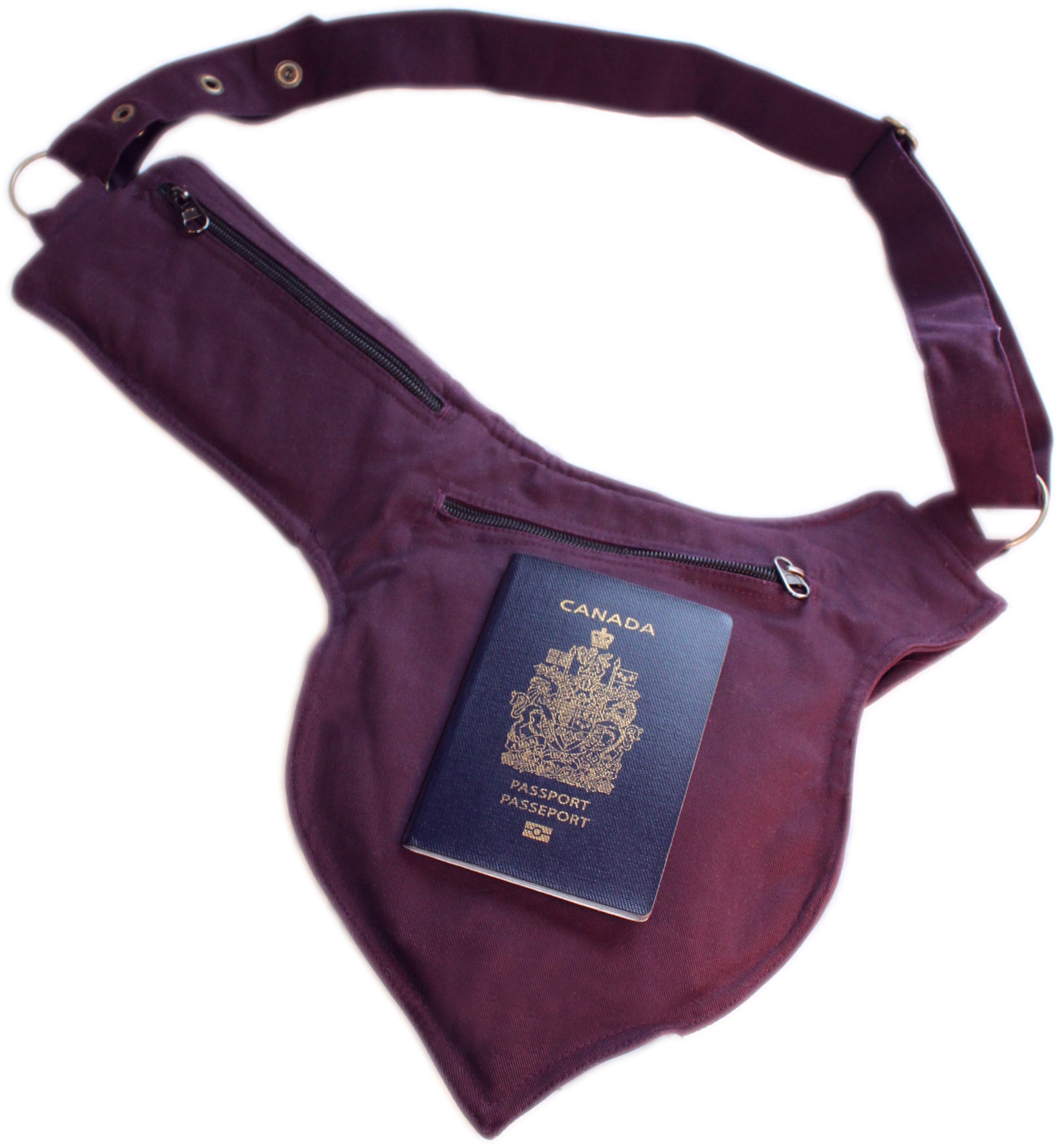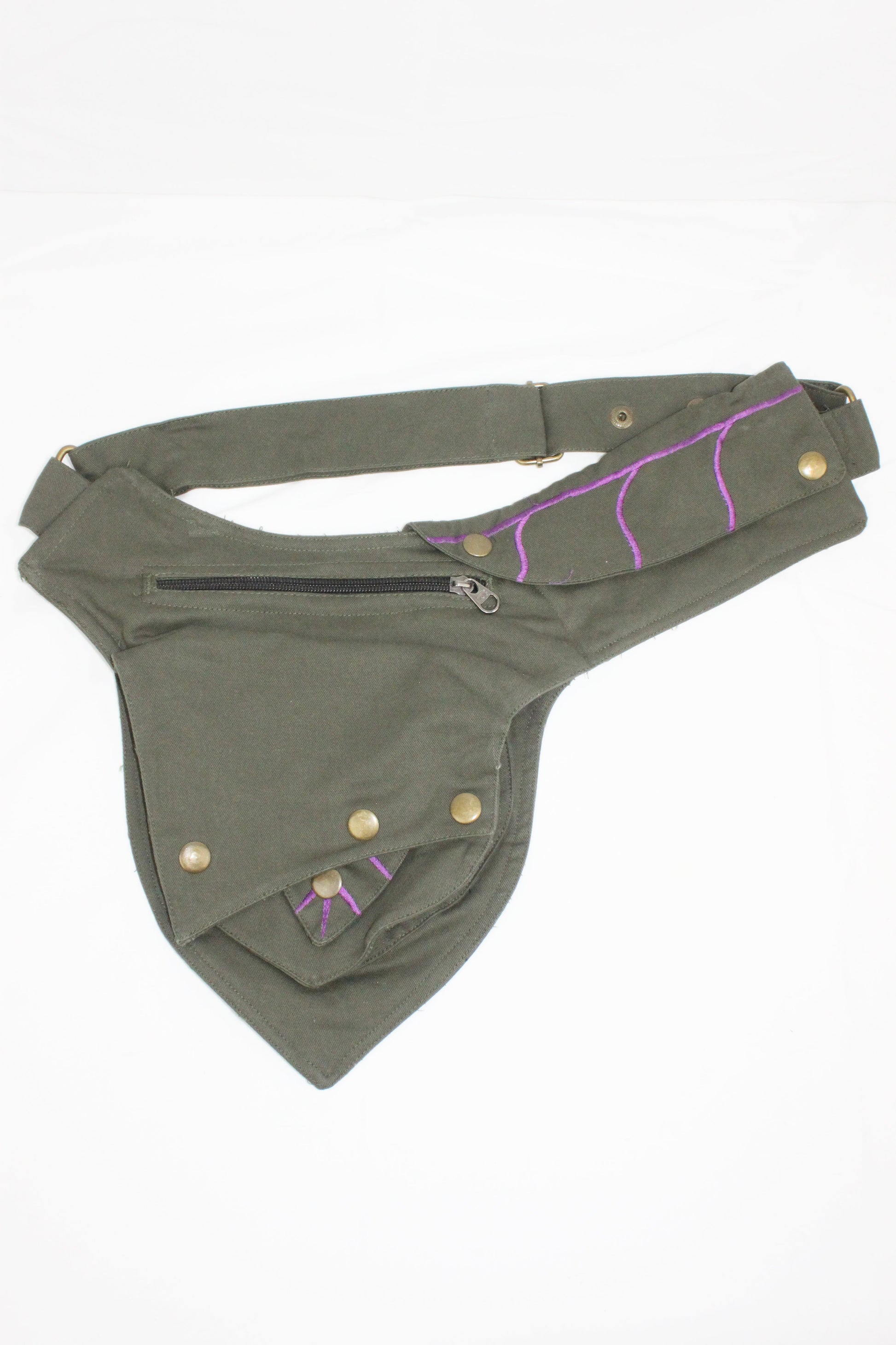As fashion-conscious travellers ourselves, we’ve designed our pockets here with specific items in mind. Our interior passport pocket zips closes to securely hold your travel documents and any large bills you don’t want exposed during your international ventures. The large zipper pocket on front holds your phone, while inside the large, snap-secured leaf pocket is another zipper pocket for your wallet or any other items you wish to hold securely. When fully extended, the large leaf pocket has space to accommodate two 12oz beverage cans. This pocket also hides another leaf pocket handy for storing miscellaneous knickknacks like crystals and essential oils, which in turn hides another baby stash pocket beneath. A pocket further up the waistband features lovely leaf embroidery, snap closures, and contains two additional pockets for items like flashlights or cash. For added measure we’ve added another zip-closure pocket at the rear of the band here to further secure your items.