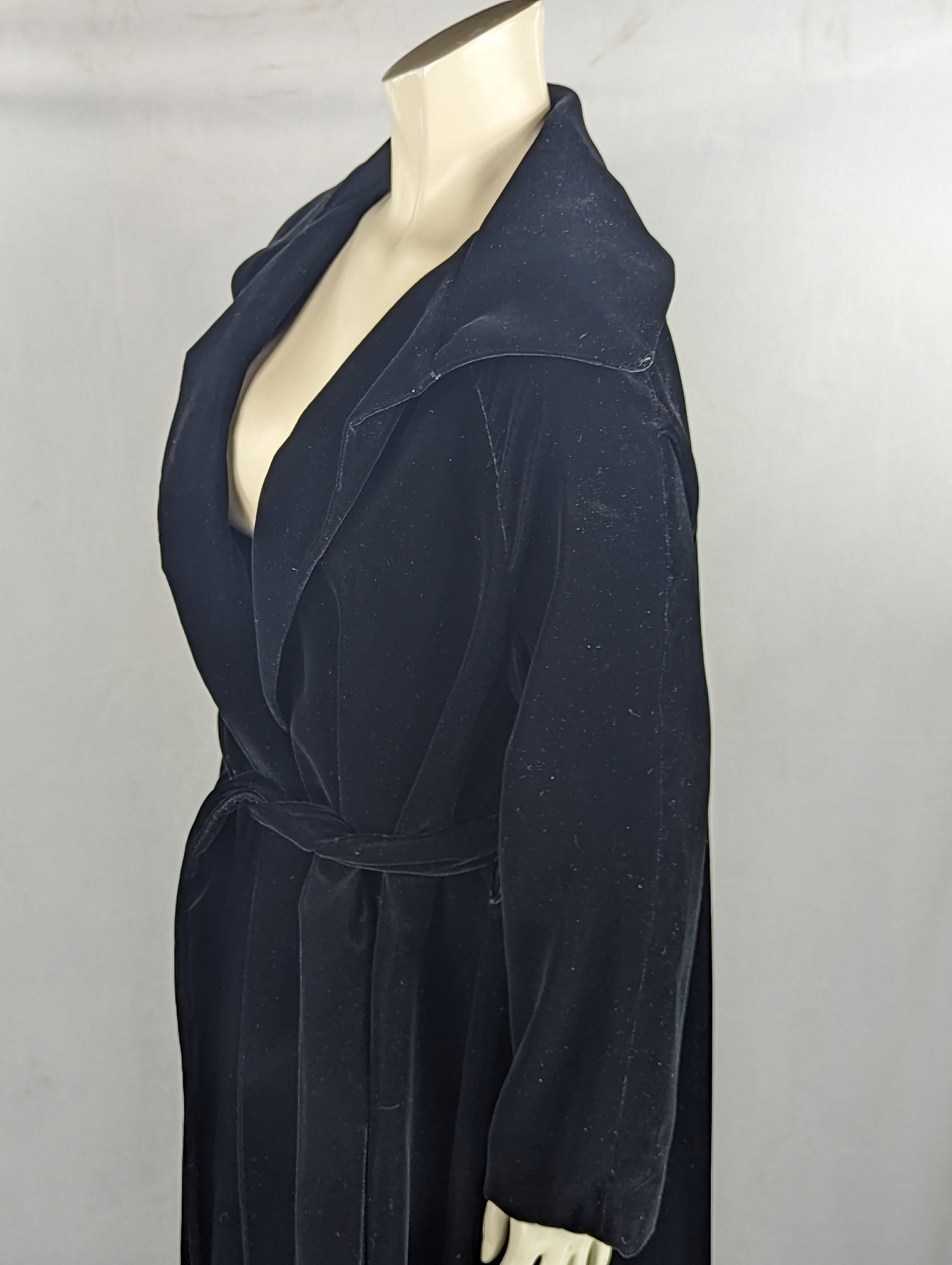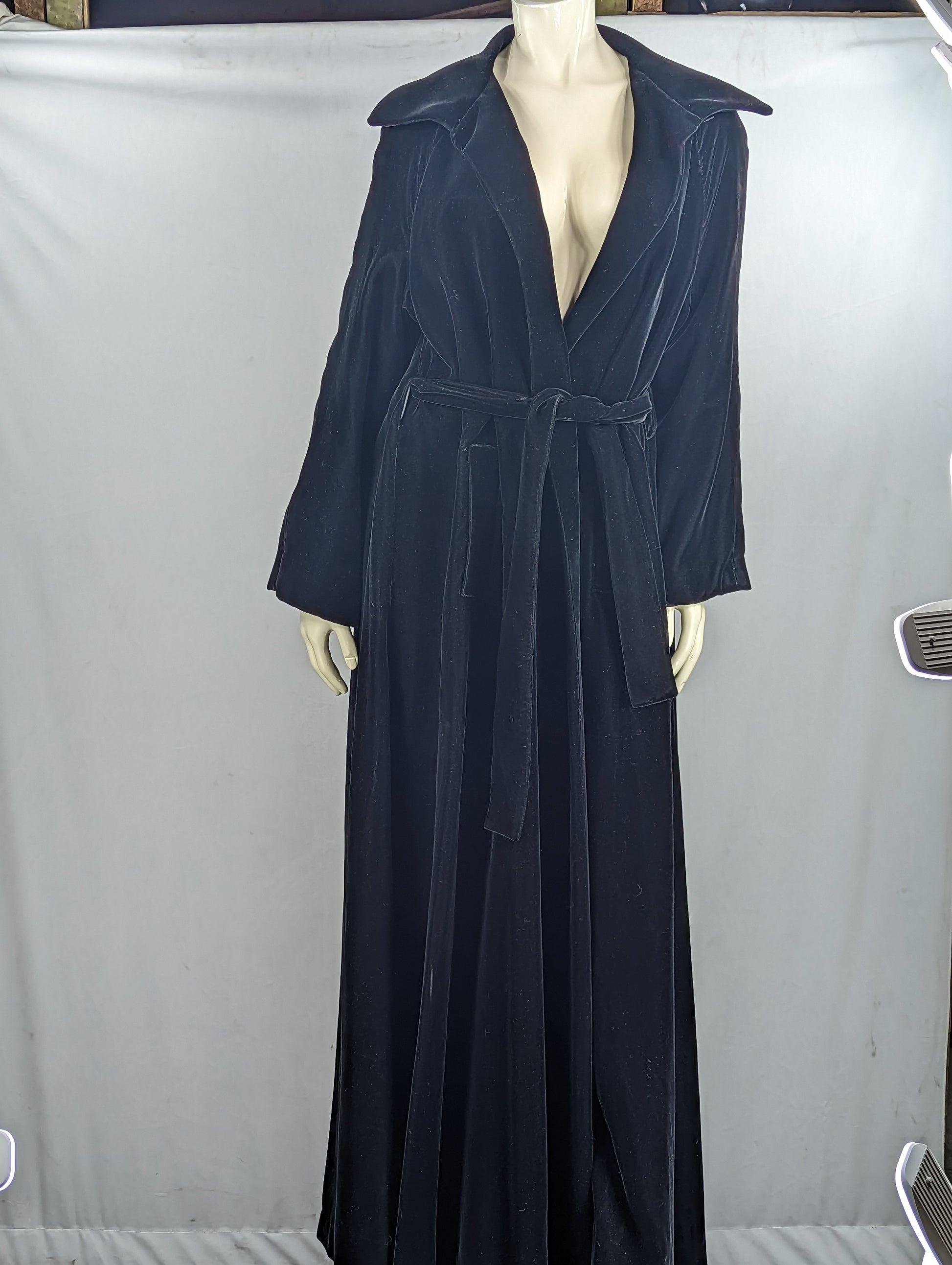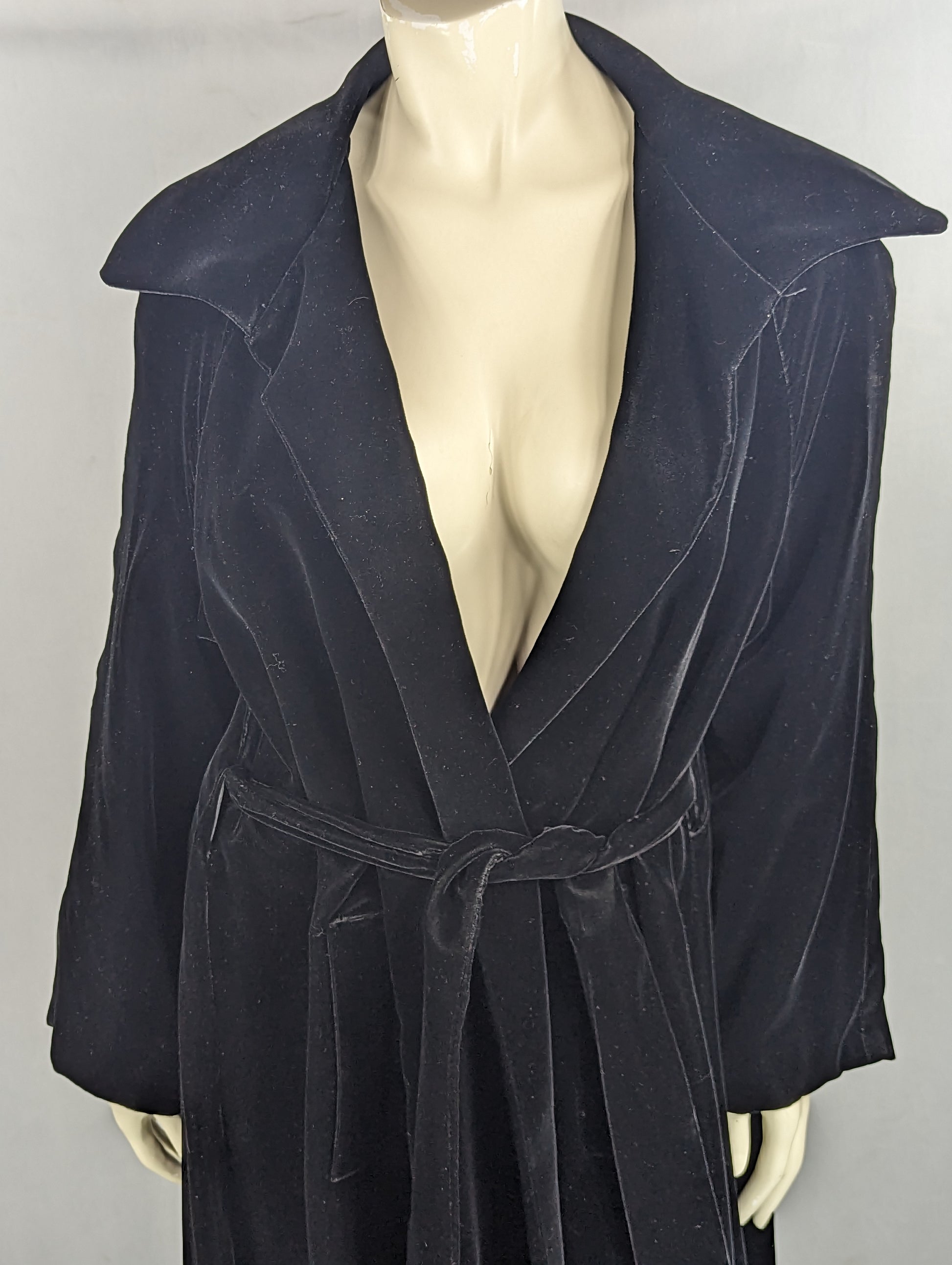 Robe style long coat with sachet tie at waist and pronounced collar and trim. Made of a nice short hair faux fur