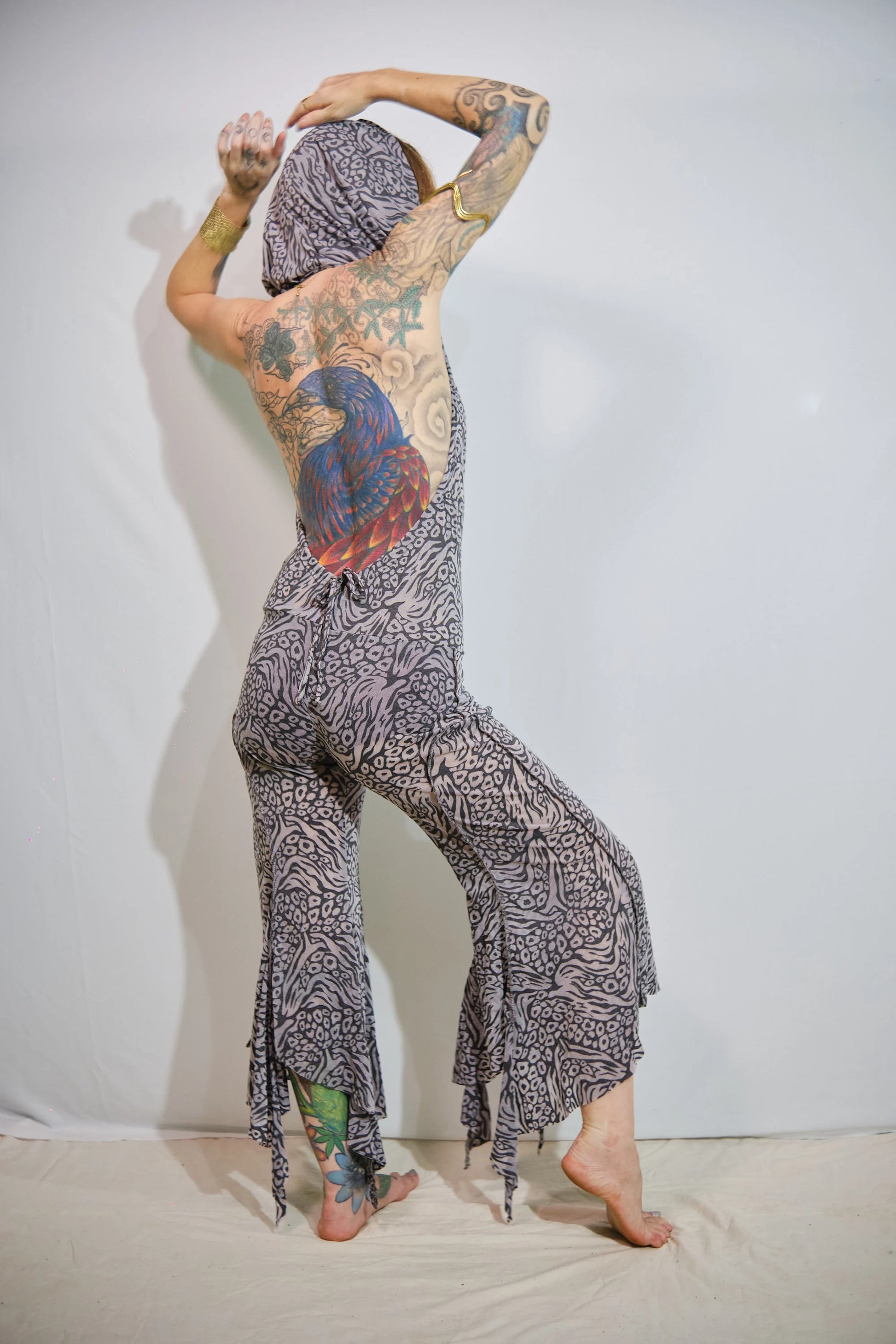 Check out this funky, flowing hooded onesie made with our unique sheer burnout material. The back is open and free to let your back enjoy the summer sun and there is a drawstring that runs though the back of the romper to ensure a perfect fit.