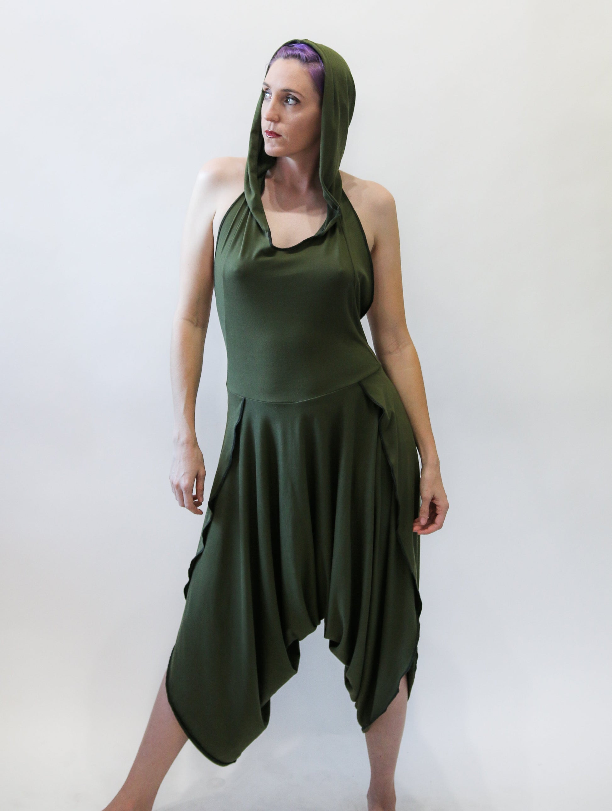 - Open back halter style with a form-fitting top and serged hem legs for a natural, wavy look.