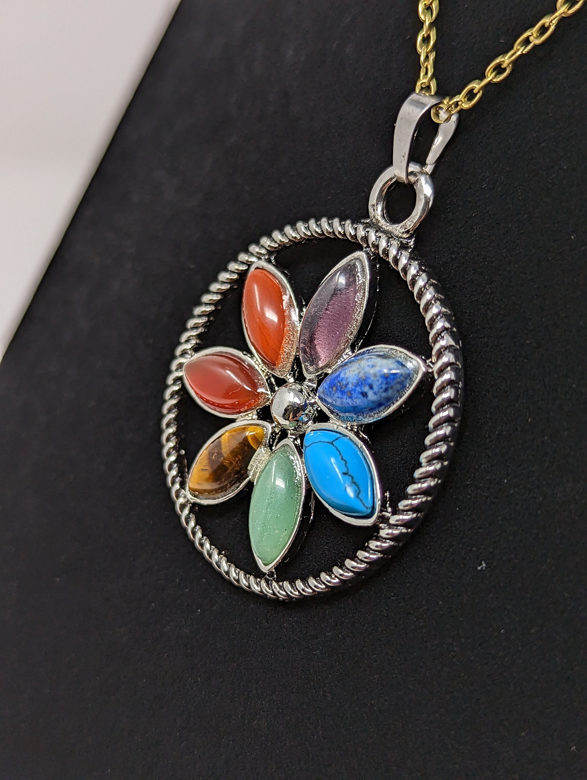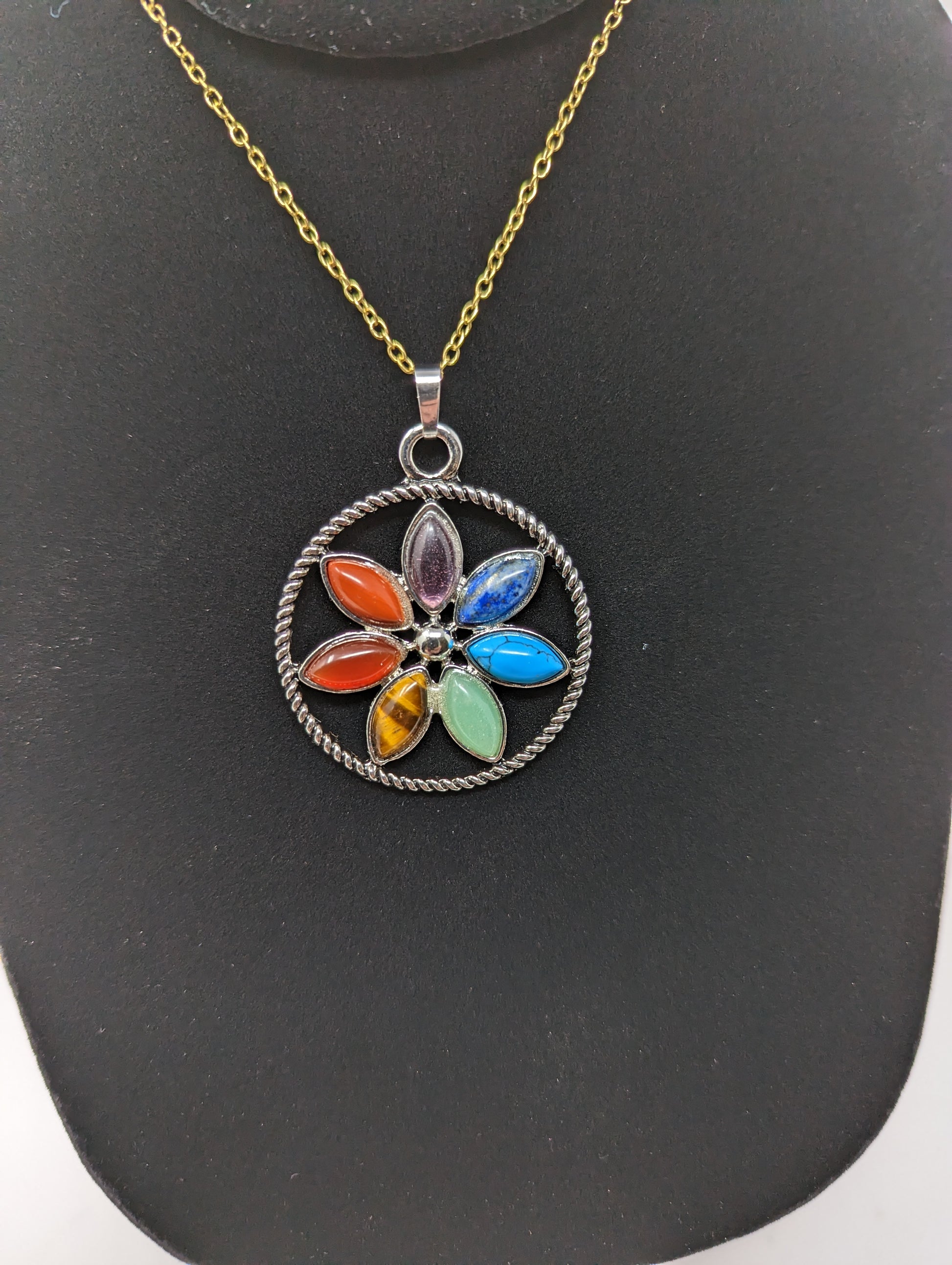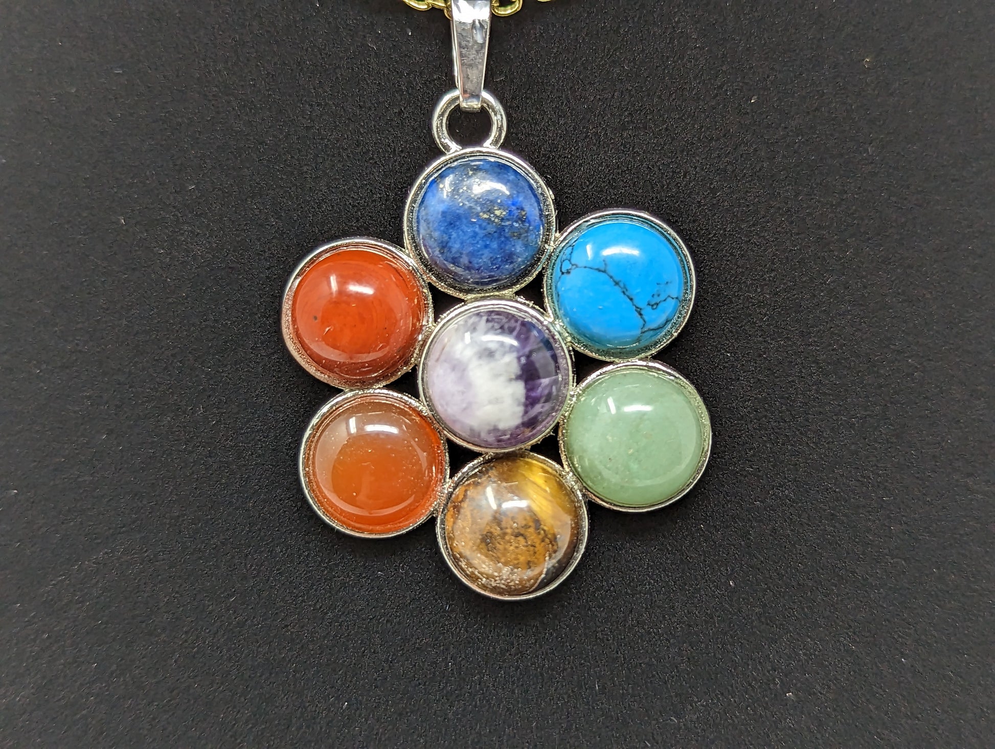 Sterling Silver Pendant with 7 chakra stones: Red Jaspar, Carnelian, Tigers Eye, Aventurine, Turquoise, Lapis and Amethyst