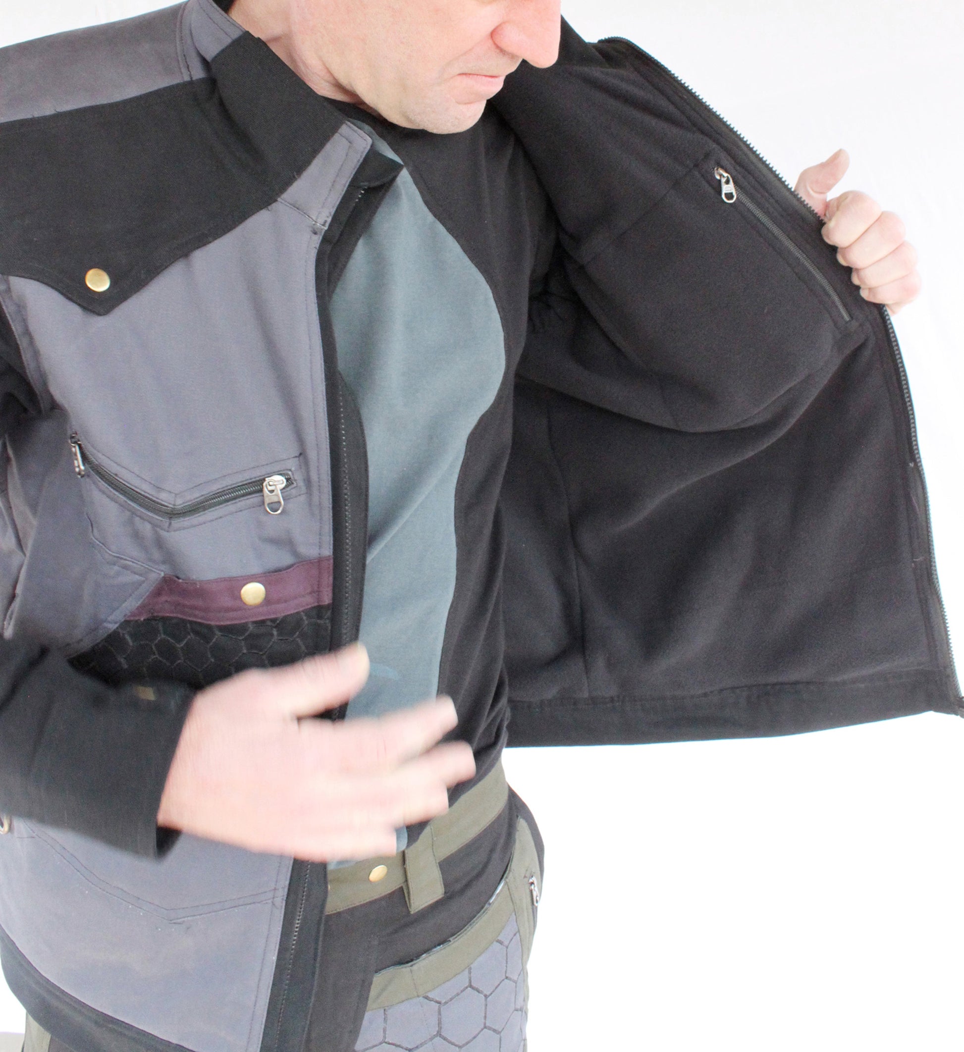 Secret pockets on either side of collar provide a secure space for valuables, while a unique V-Shaped series of snaps in the back opens into a large pocket capable of holding water bladders or other large items.