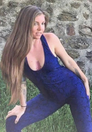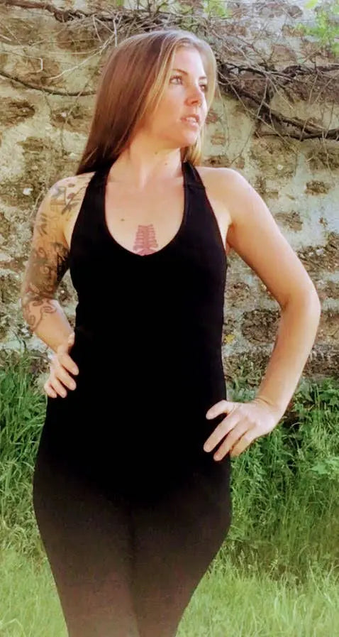 Super fun and comfortable bodysuit or romper for dance, aerial, the gym. This capri length onesie has a built in shelf bra top and a super cute open back.