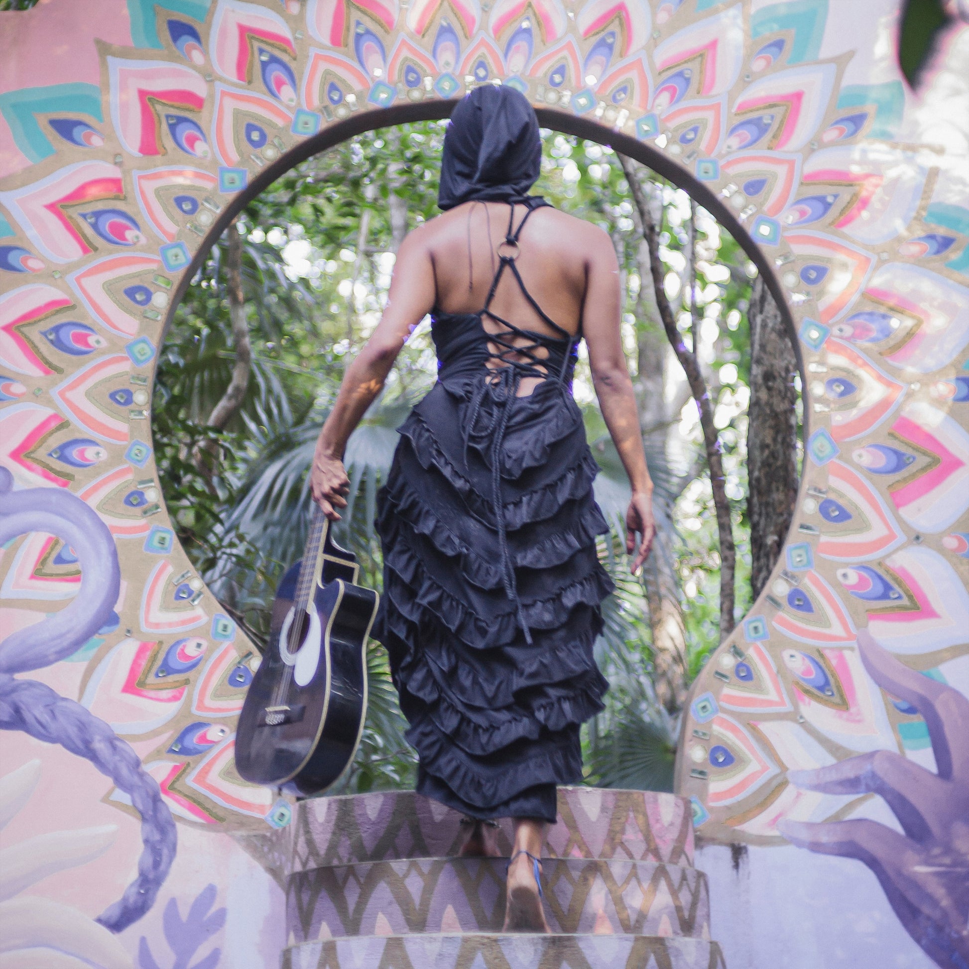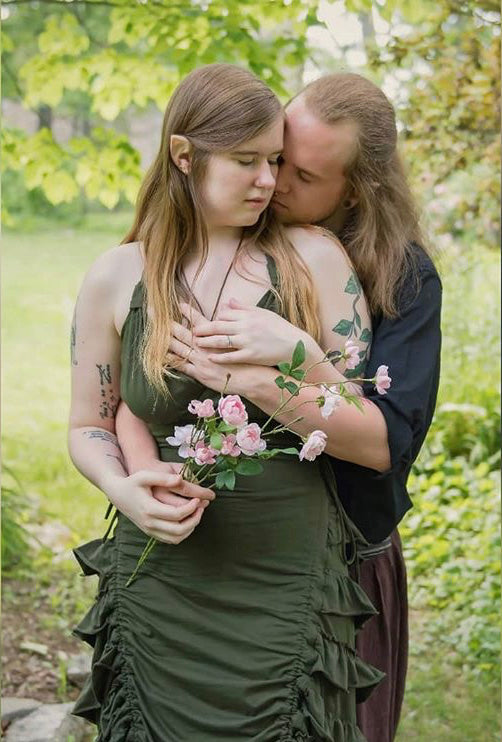 Are you a petite fairy? Or a voluptuous goddess? This dress will fit either. Carefully conceived to encompass any shape, use the bust panel ‘cuffs’ to alter the shape and fit of each of your ‘gals’. Make sure to pull and lift the bust panels towards your back when tightening the dress : everything is relative after all. Coax the braided rope ties to your desired fit and use the ends as you wish, wrap them in front of your body for a Avalon look..