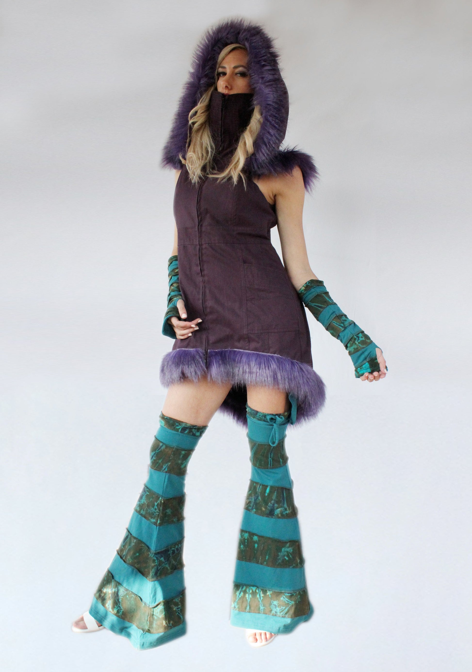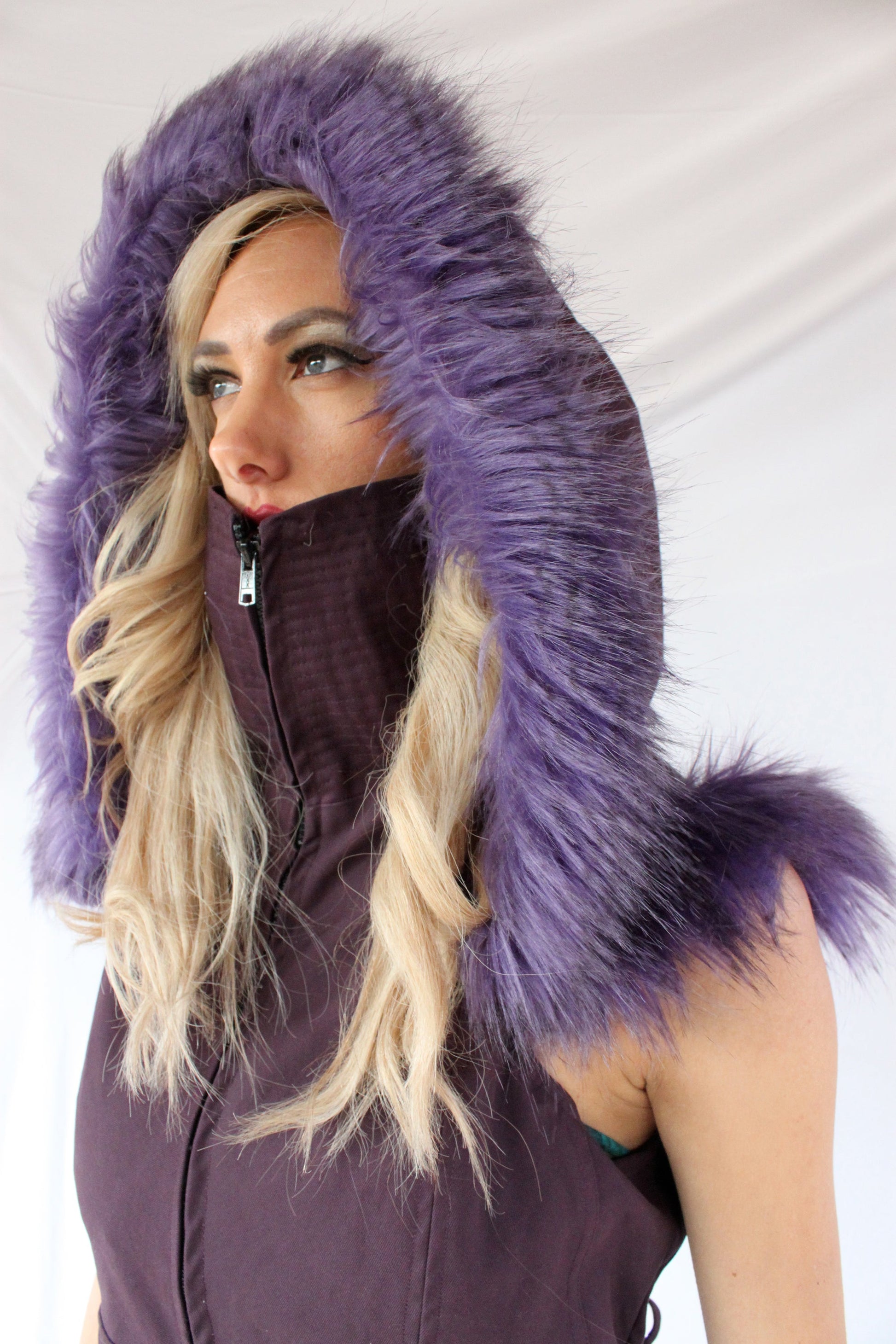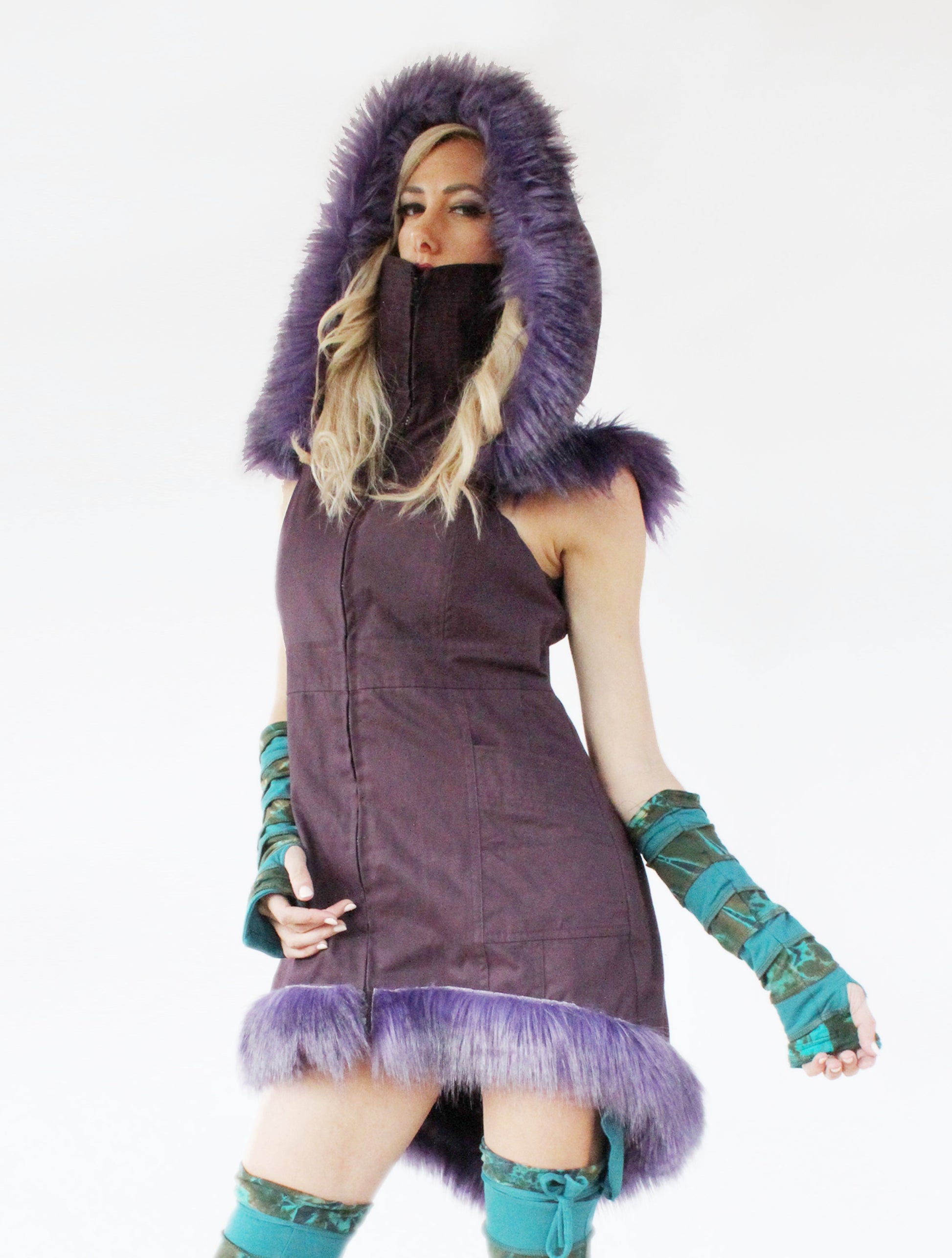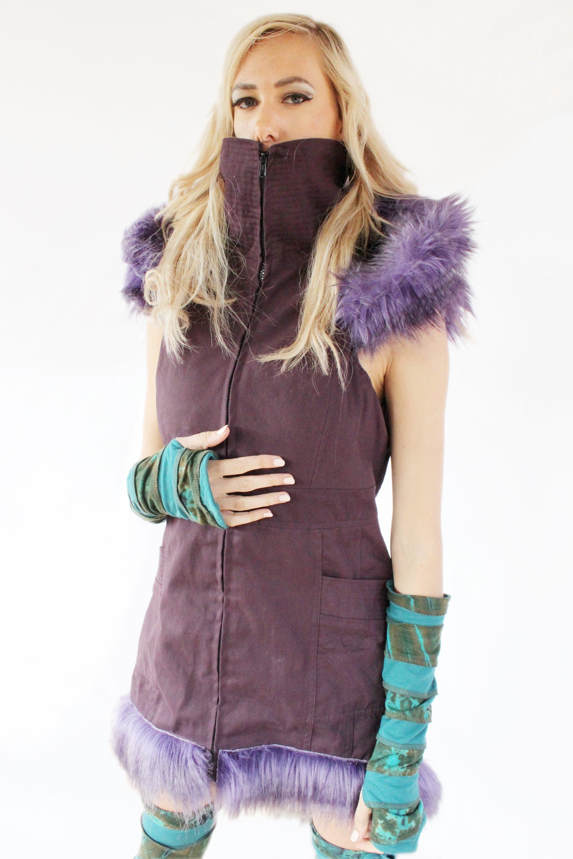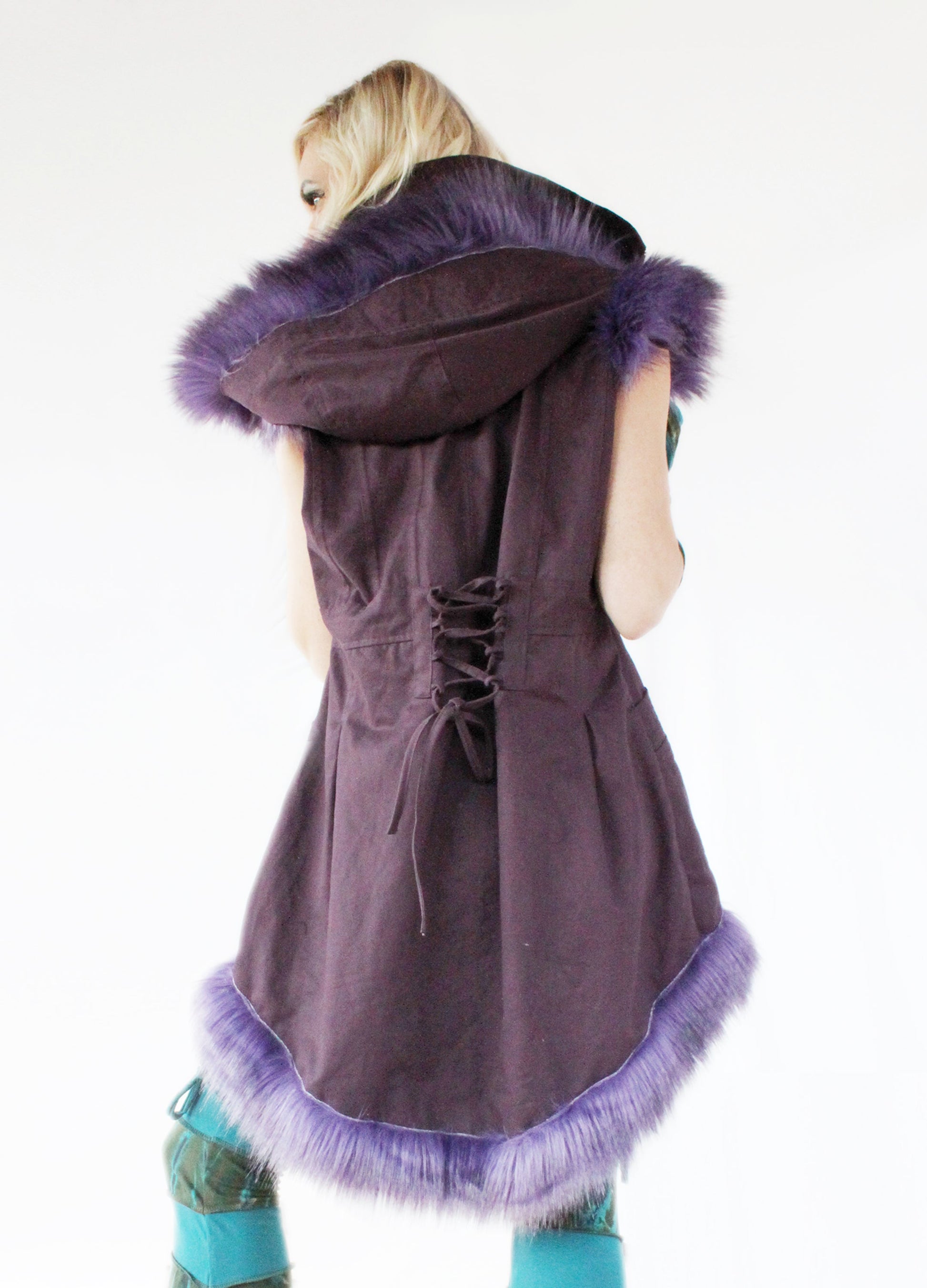 Level up with the sassy fairy wear armour like fitted twill vest! With Viking like elements of fun fur on the shoulders as well as hood and bottom fringe: you’ll feel like an Amazon warrior. Pull our your bow and arrow while your essentials are in your front pockets. Zip up your collar and flip the druid hood as you mount your horse. With a corset lace up on the back, wear tightened for an hourglass shape.