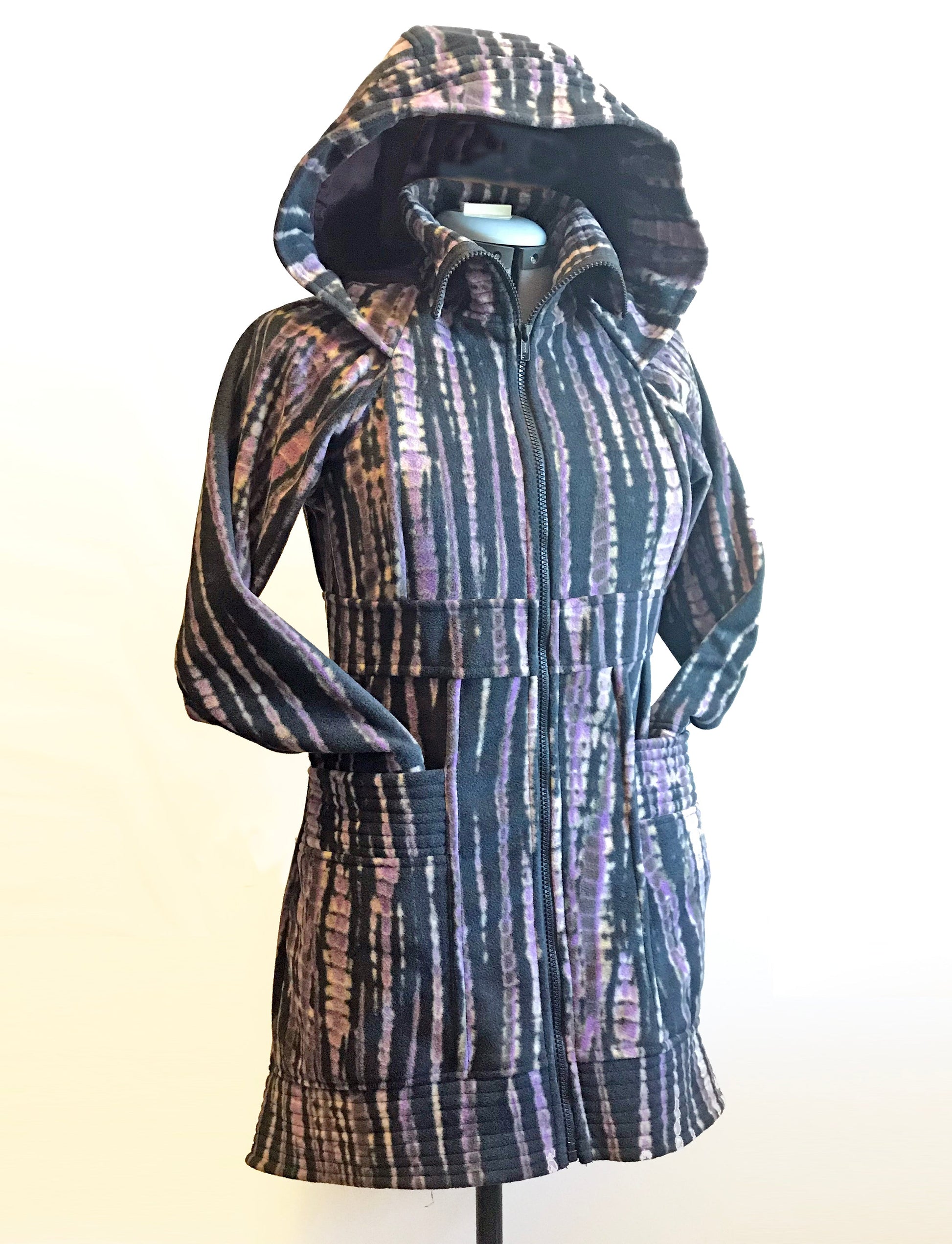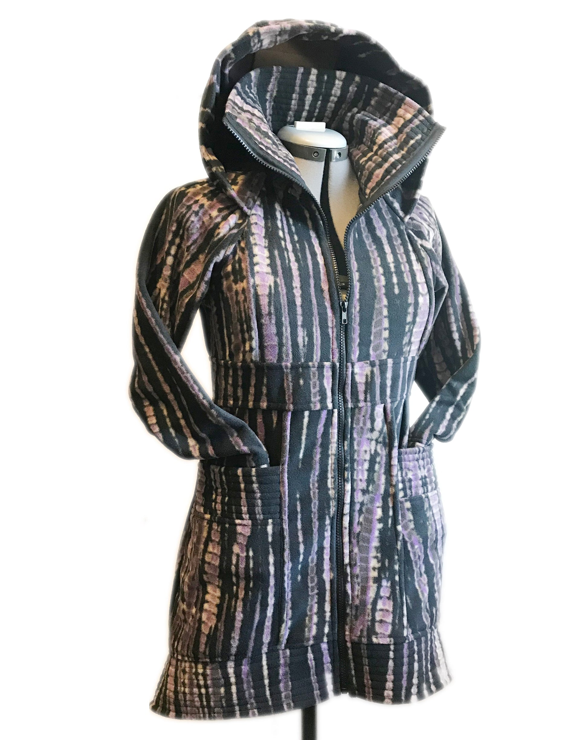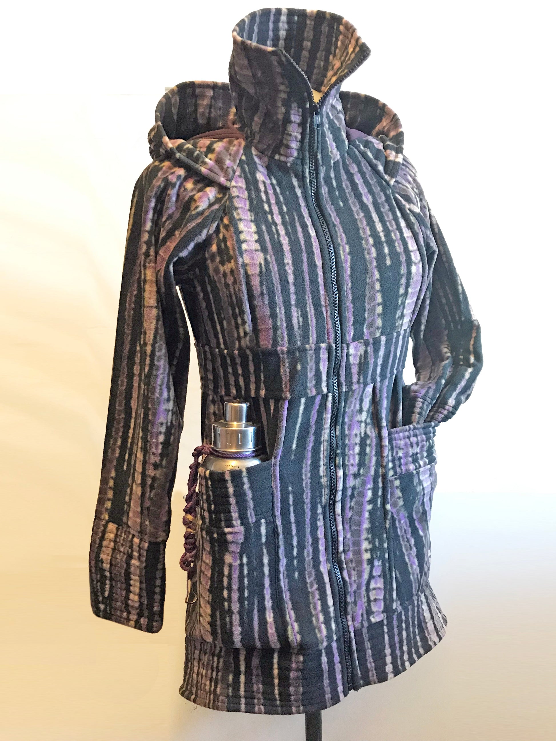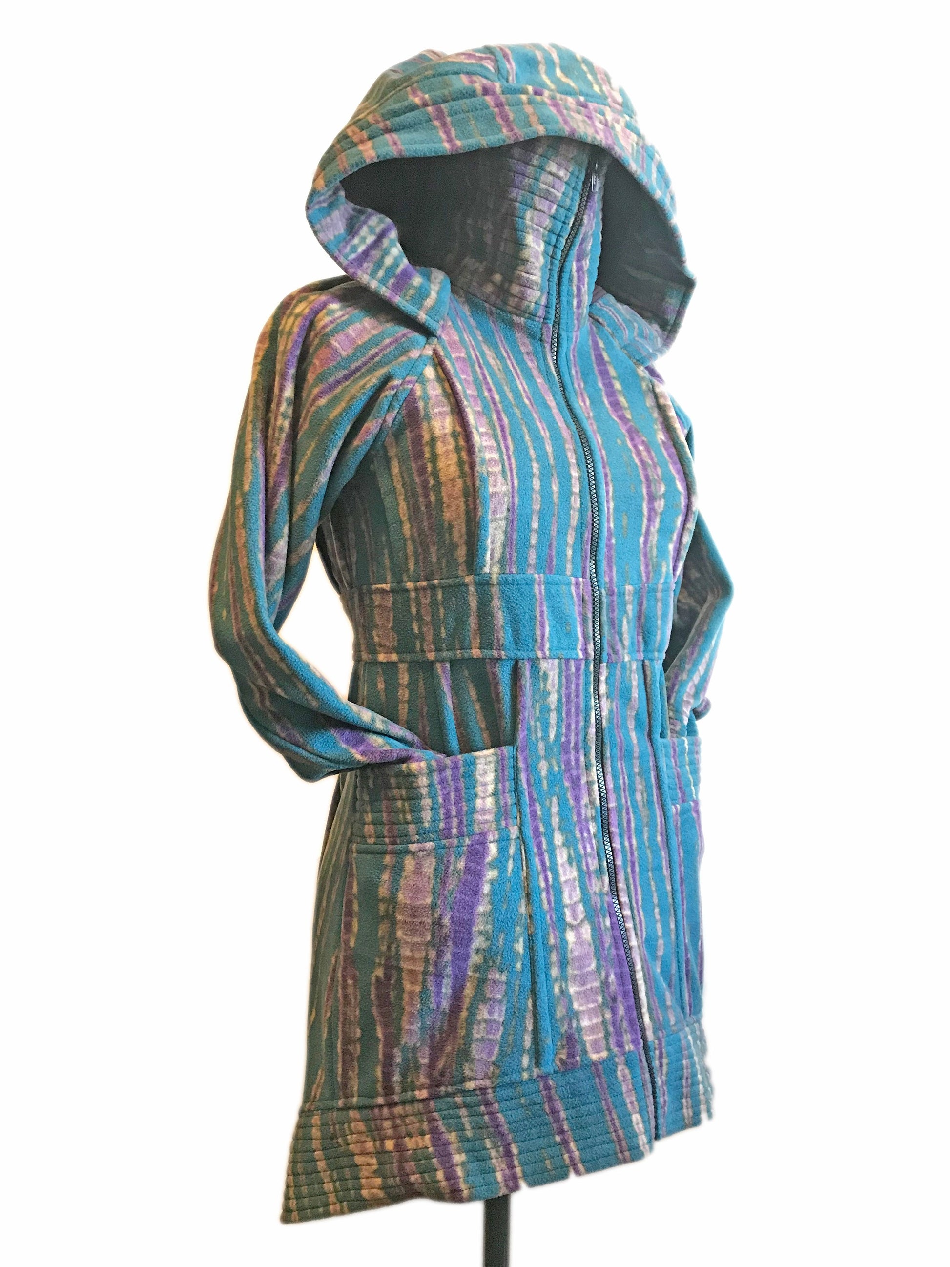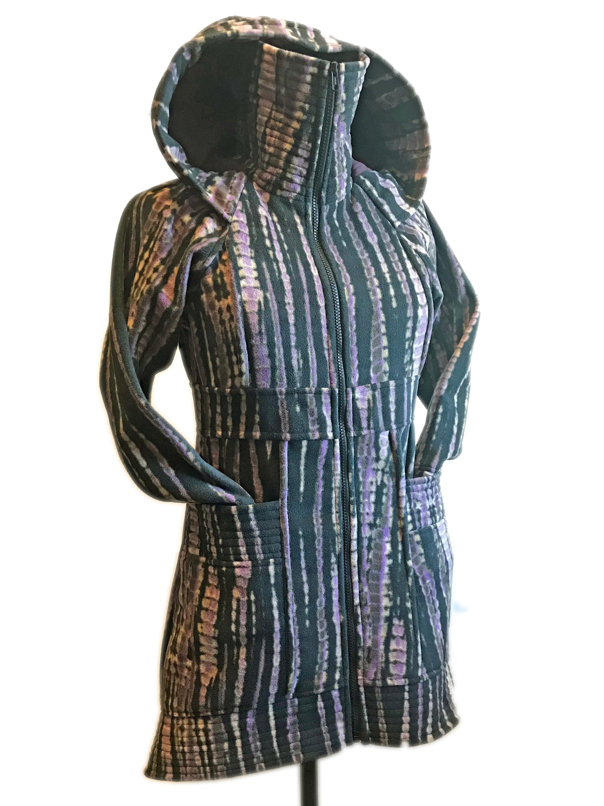 Adorable while being functional and comfortable. The super soft Fairies Fleecey will keep you warm, prepared, and can be worn under your parka too. In a flattering hourglass shape along with vertical Tie Dyed stripes, this hoody is slimming while serving your fairy needs for generous pockets and a lined hood.