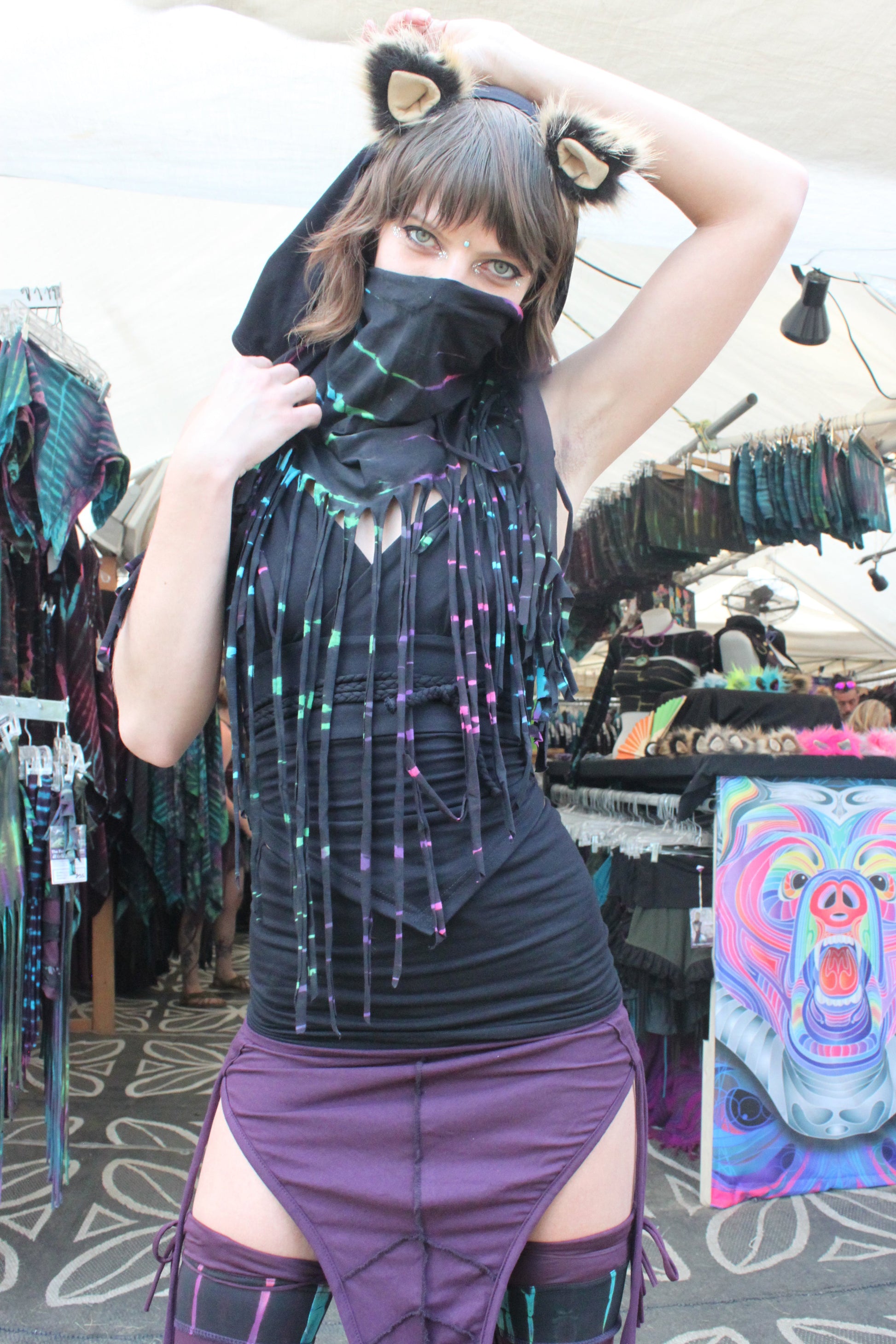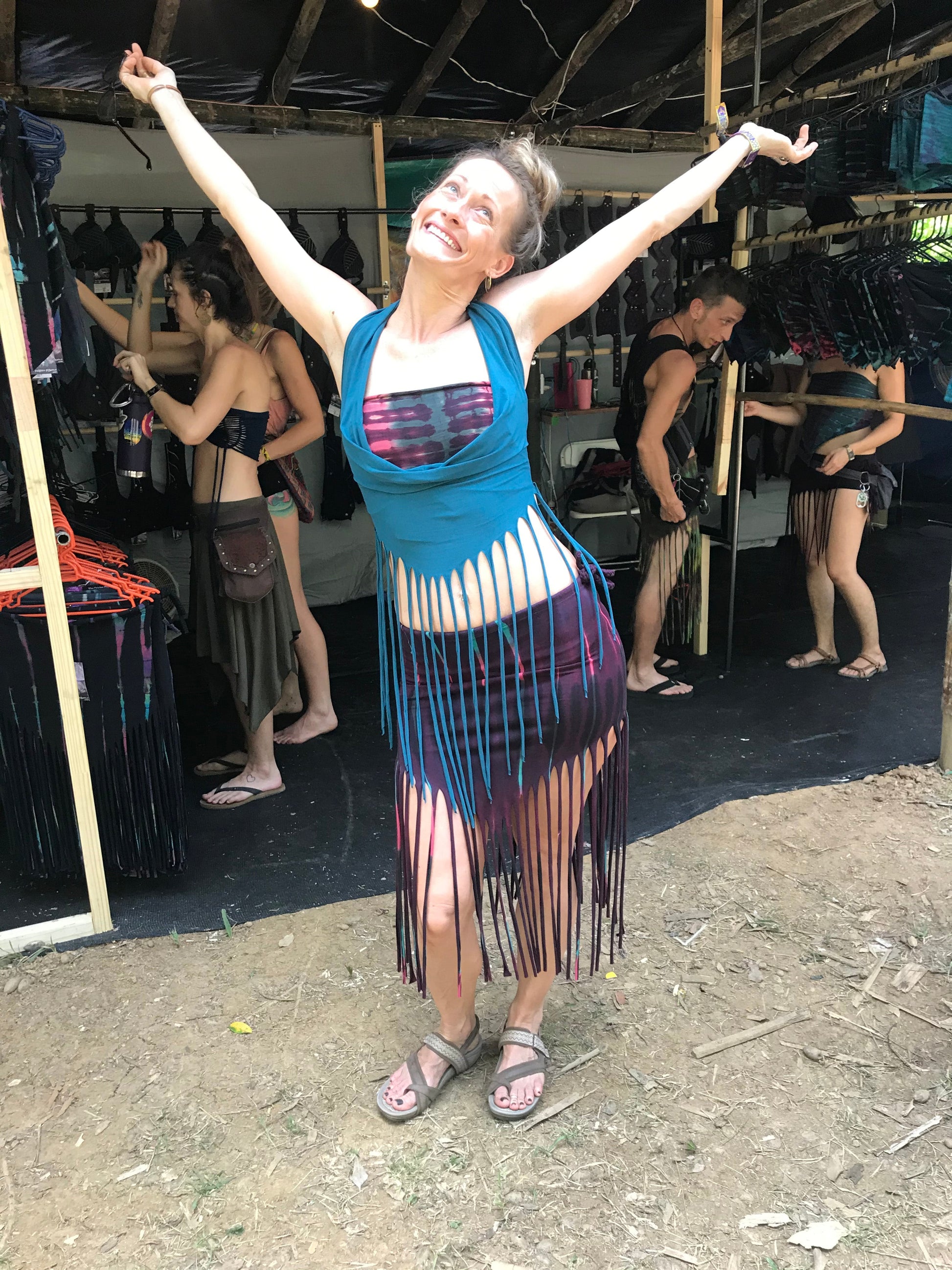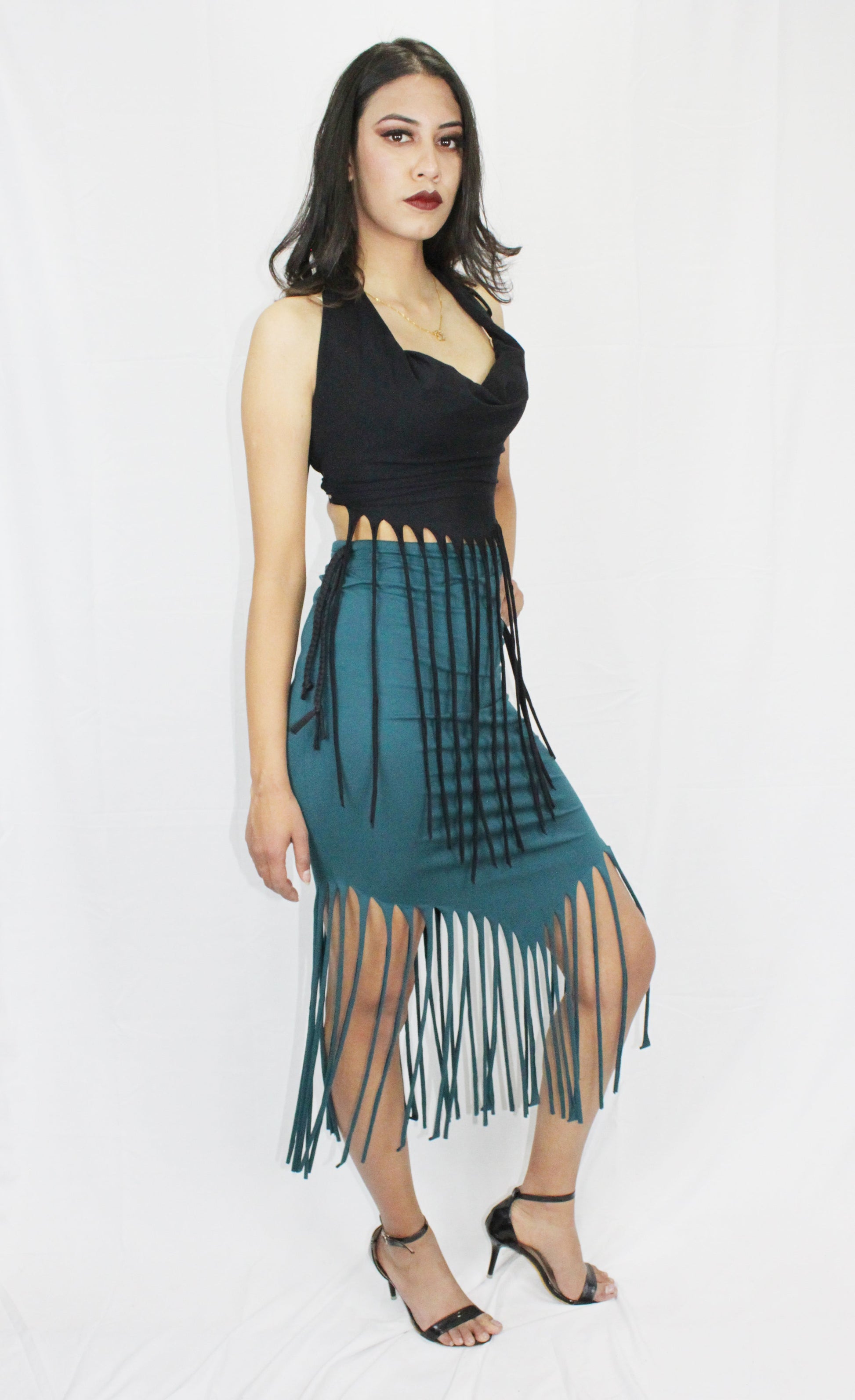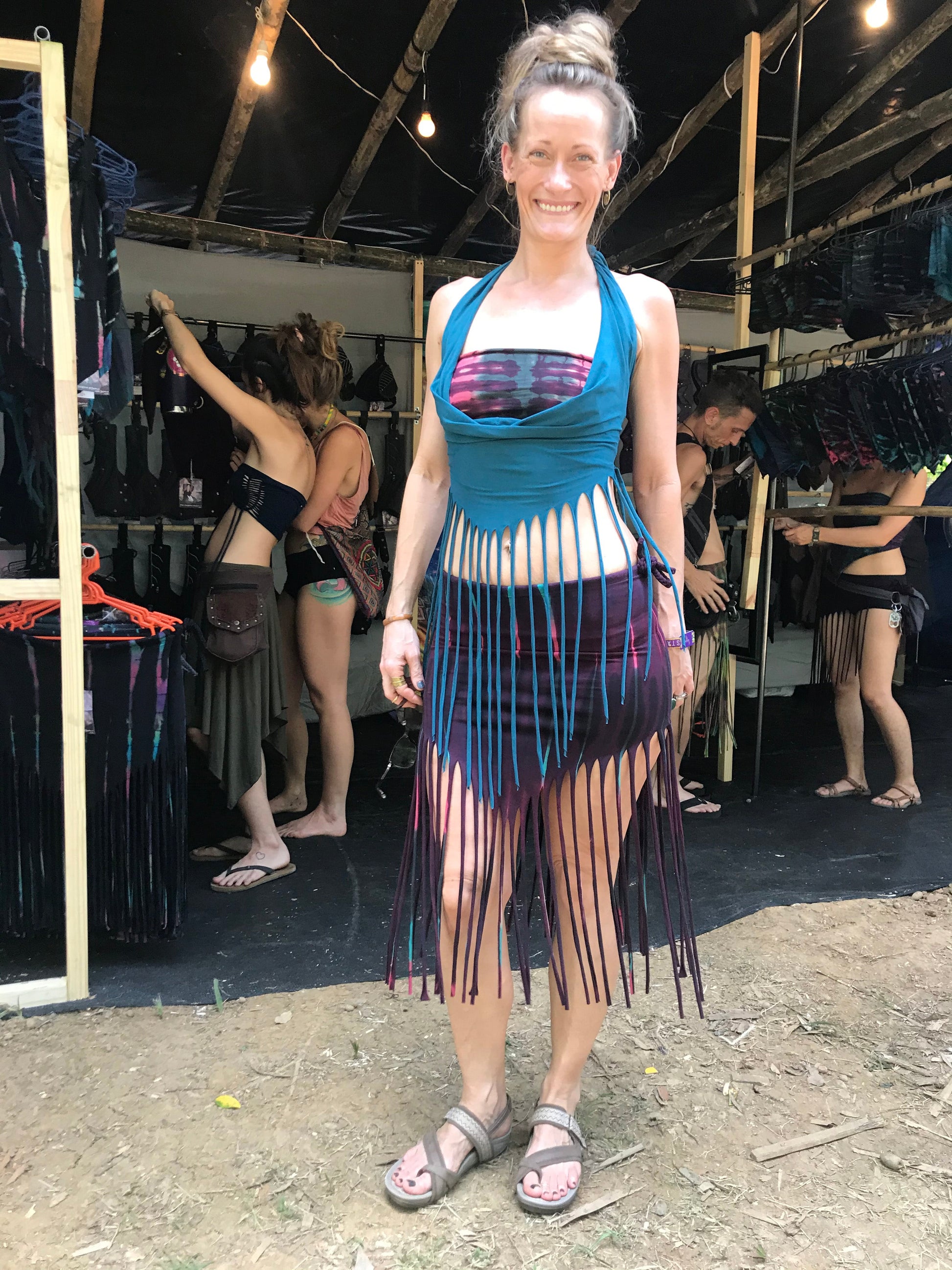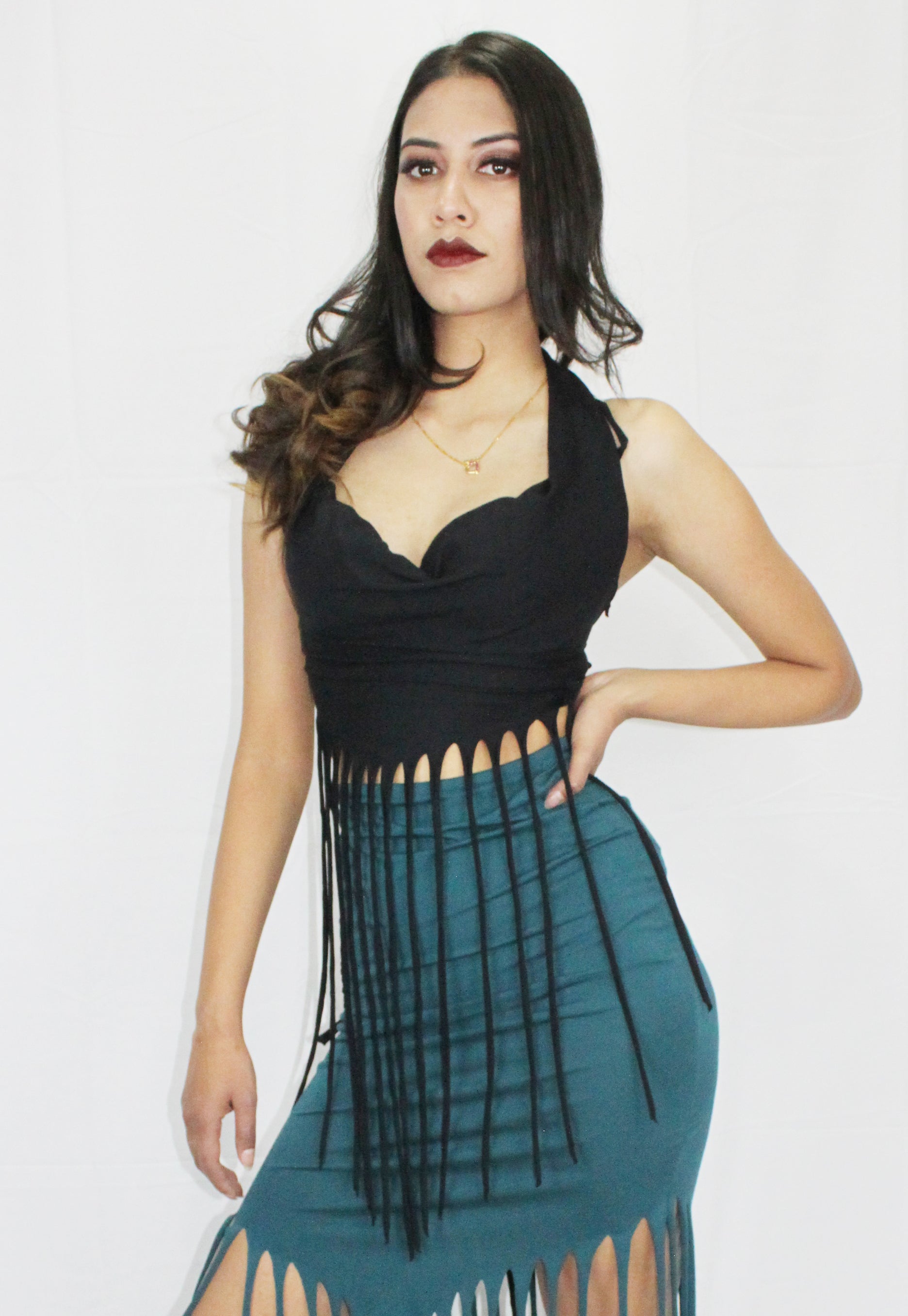 Top as halter with fringe in front: tie the wrap behind your neck like a ‘bib’ , then take some of the side fringe and tie those together behind your back. Adjust the halter as desired and wear a Bandeau underneath if you like.