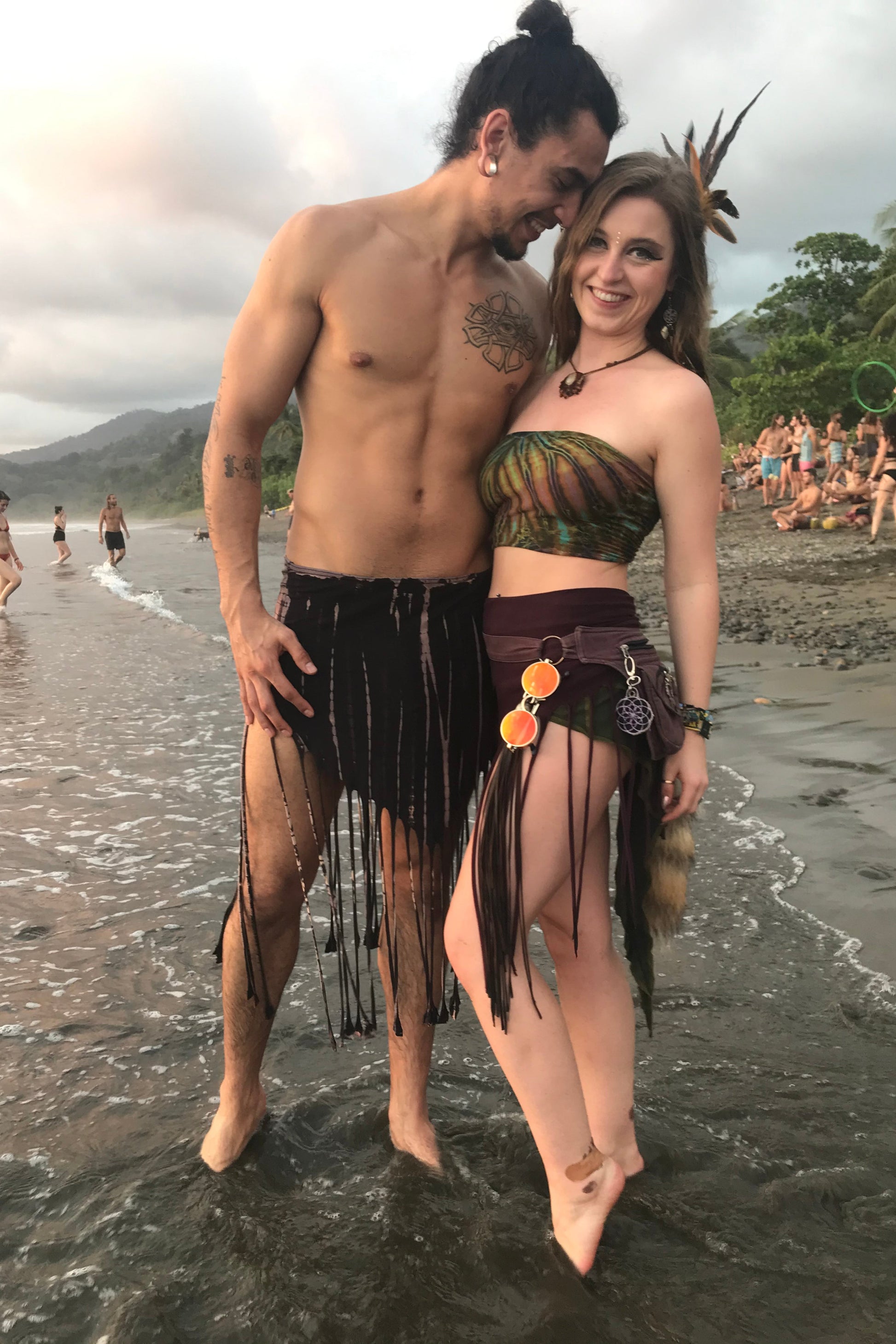 Skirt: wrap it low around your hips, with one side a little longer than the other, take the shorter end on top of the lower and tie the very ends together on the opposite side. Or just wrap on one side.