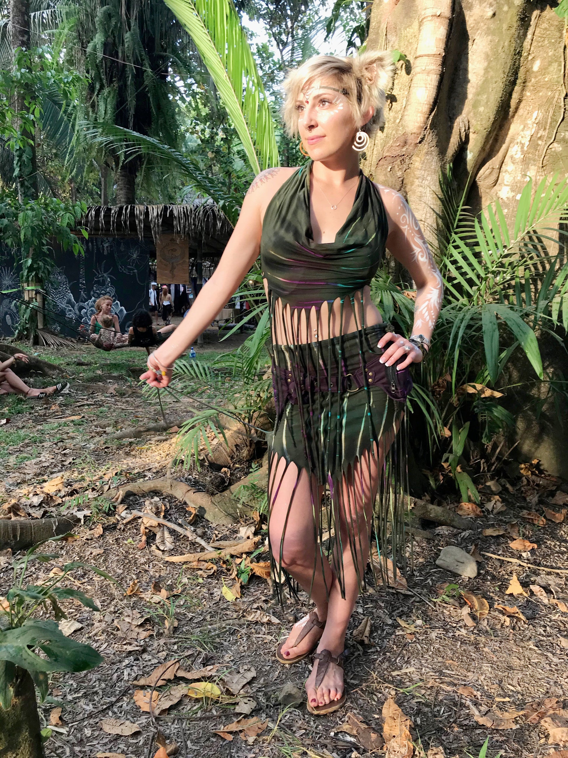 To wear as a top: literally tie the wrap behind your neck like a ‘bib’, then take some of the fringe on the side and tie those together behind your back.
