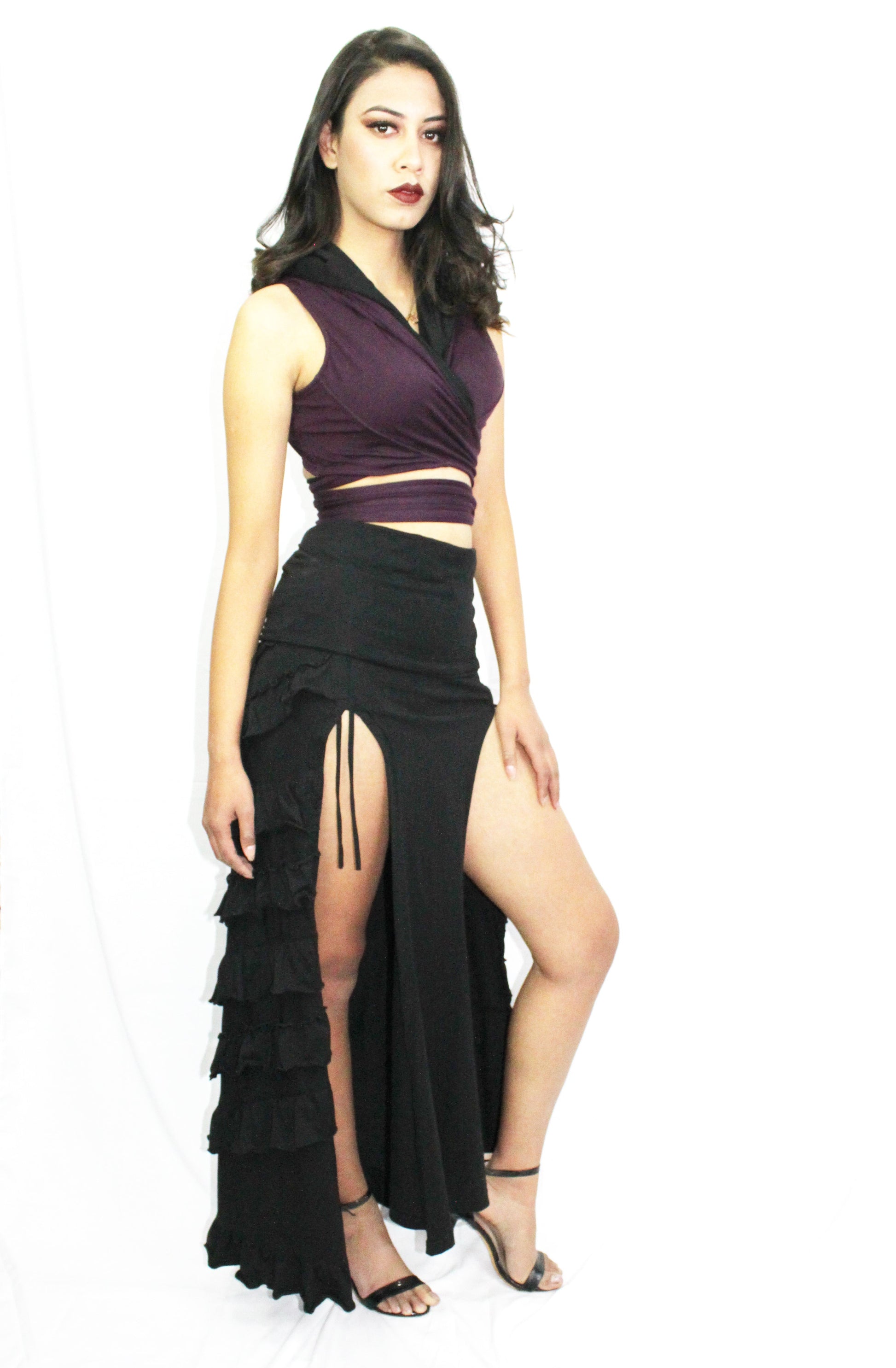 Elevate your outfit and show off your legs in the Fairy Ren-Faire Skirt. Inspired by burlesque, sexy bohemian and renaissance fairs ; this full length skirt adds a cosplay flair to any outfit. With functional adjustable ties to change the length, a fold over waist band to flatten the tummy and layered ruffles on the back for a bustle like effect, lead with your legs to your next event.